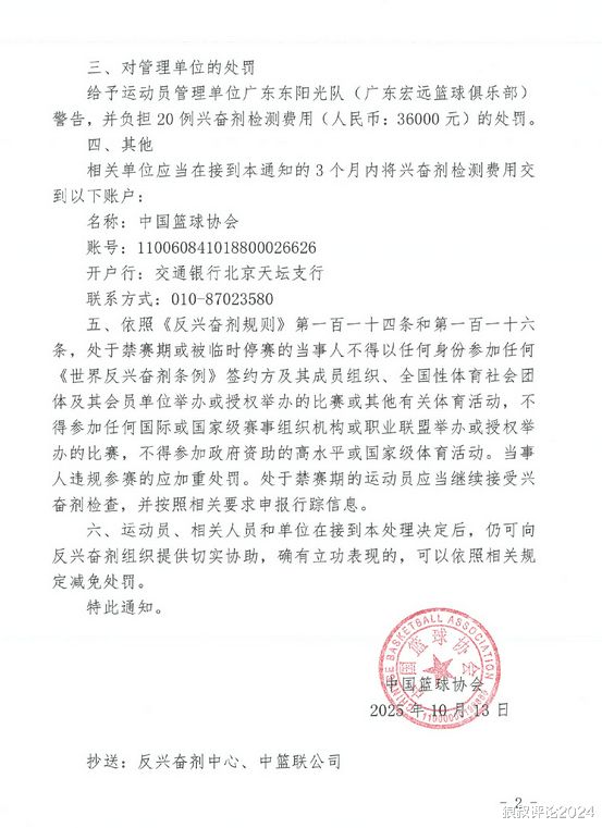 中国篮协根据《关于严格禁止体育运动中使用兴奋剂行为的规定》以及《国际篮联章程》相关规定,给予当事人威廉姆斯禁赛6个月的处罚,同时对山西中宇俱乐部主教练处以5000元罚款,对山西中宇俱乐部处以10000元罚款。