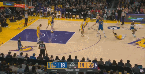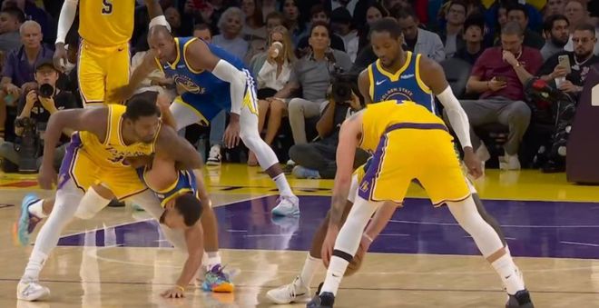 斯玛特与库里抢位置时,直接锁住了库里的肩膀,在缠斗中,库里直接被放倒了